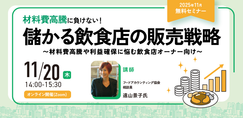 11/20(木)開催の「材料費高騰に負けない!儲かる飲食店の販売戦略」のアーカイブ配信を12/10(水)まで行います。